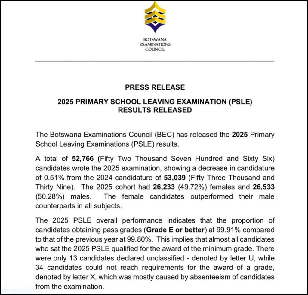 The Botswana Examinations Council has released the Botswana PSLE Results 2025, revealing strong overall performance in this year’s Primary School Leaving Examination. According to the official statistics, 52,766 pupils sat for the 2025 exams, showing a slight drop from the 53,039 candidates recorded in 2024. The newly published report emphasizes noticeable improvements across all major performance indicators and continued growth in the learning achievements of candidates.