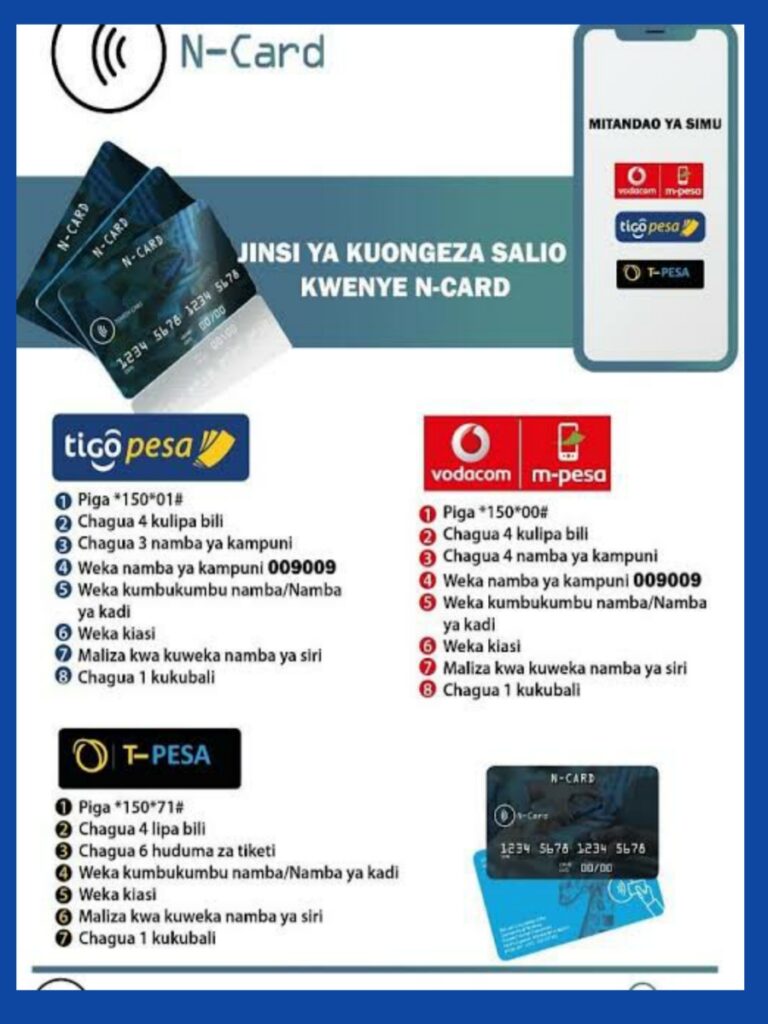 Kwa bahati nzuri, kuongeza salio kwenye N-Card ni rahisi kupitia huduma kuu za kifedha kwa simu nchini Tanzania: M-Pesa (Vodacom), Mixx by Yas (Tigo Pesa), Airtel Money, na sasa pia Halopesa.
