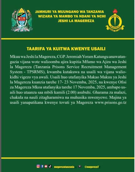 Jeshi la Magereza limetangaza majina ya waombaji ajira / kazi waliochaguliwa kushiriki kwenye usaili kwa mwaka 2025, hatua inayolenga kupata watumishi wapya watakaounganisha nguvu katika kulinda usalama na kusimamia haki za wahalifu waliopo magerezani.