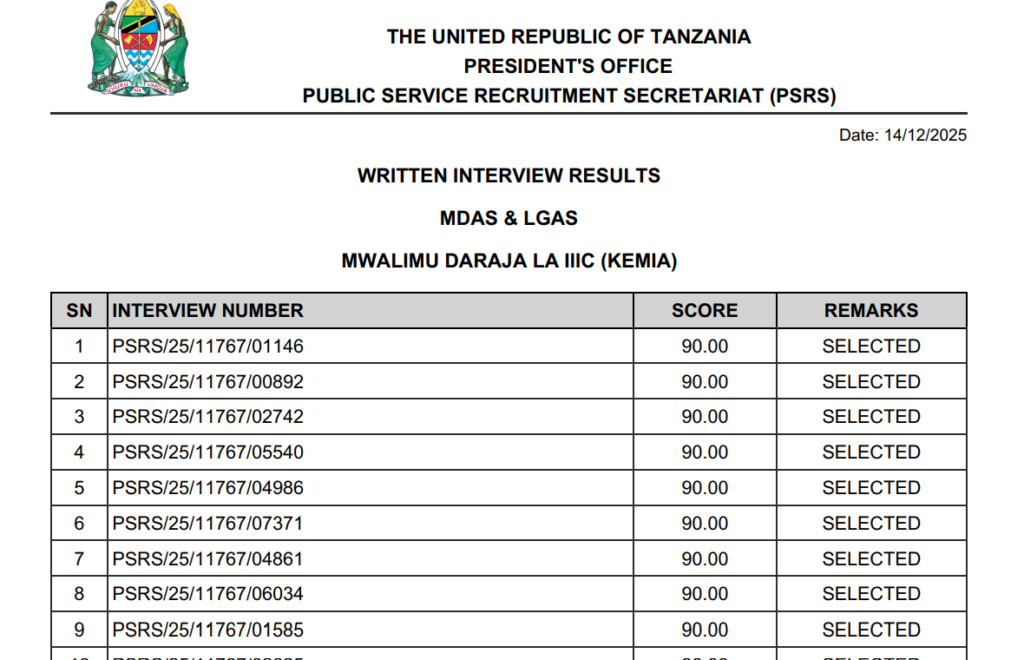 Matokeo ya Usaili wa Kuandika Mwalimu Daraja III C Kemia ajira portal yametangazwa rasmi, yakionesha majina ya waombaji waliofanikiwa kufaulu hatua hii muhimu ya mchakato wa ajira. Usaili huu ulilenga kupima uelewa wa kitaaluma, uwezo wa kufundisha somo la Kemia, pamoja na ujuzi wa kuwasilisha majibu kwa usahihi kulingana na mtaala husika.